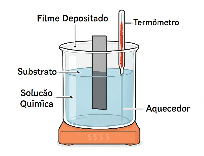 A deposição de banho químico consiste em uma técnica acessível e de fácil execução, utilizada para produzir filmes finos semicondutores. O processo envolve a imersão de um substrato (onde o filme será depositado) em uma solução aquosa que contém íons precursores do material a ser depositado [4]. A formação do filme ocorre por meio de uma reação química controlada na solução, que resulta na precipitação lenta e homogênea dos íons sobre a superfície do substrato.