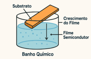 A técnica de Deposição de Banho Químico (CBD) constitui um dos métodos mais relevantes para a fabricação de células solares de filmes finos, destacando-se por sua simplicidade, baixo custo e potencial de escalabilidade. A possibilidade de operar em baixas temperaturas, aliada à capacidade de recobrir grandes áreas de forma uniforme, torna a CBD particularmente vantajosa para aplicações industriais, contribuindo de maneira significativa para a redução dos custos de produção de dispositivos fotovoltaicos.