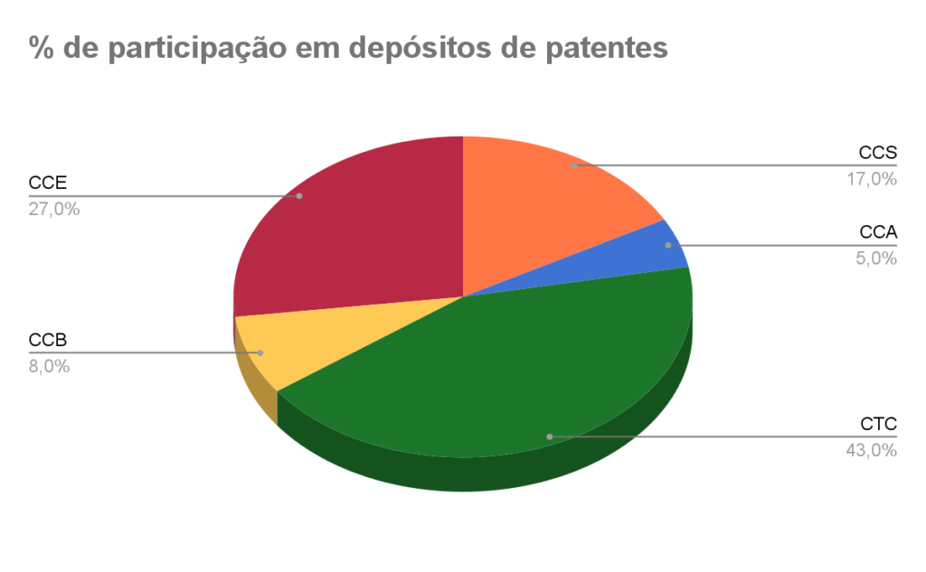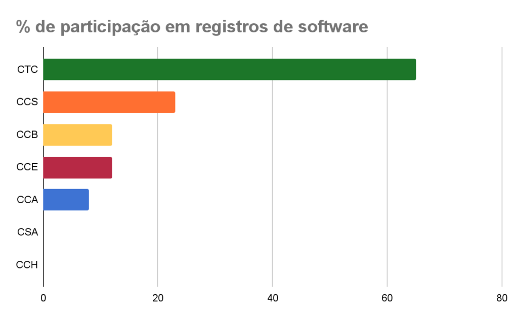 No que tange às patentes, o Centro de Tecnologia e Centro de Ciências Exatas, juntos, somam 70% dos registros, um número bastante expressivo. Ademais, em relação aos softwares, o número é ainda maior, totalizando 88% do total de registros.