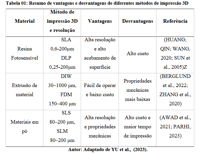 Além disso, as vantagens e desvantagens de alguns dos principais métodos de impressão 3D de materiais adsorventes são apresentadas de acordo com a Tabela 01.