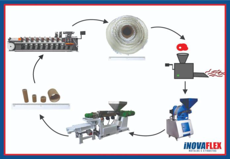 O estudo propõe desenvolver um processo de reciclagem desse resíduo, aproveitando-o para a fabricação de tubetes (tubos de diâmetros variados, usados como falso eixo e armazenamento de filmes de impressão) a partir de um compósito feito com uma matriz de Polipropileno Biorientado (BOPP) reciclado e reforço de aparas e avaliar a viabilidade de substituir o feito de papelão comercialmente utilizado, fechando assim um ciclo de reciclagem dentro da indústria, como é apresentado na Figura 1.