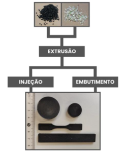 Para esse estudo foram fabricados corpos de provas de BOPP puro reciclado e com 10, 20 e 30% de porcentagem de massa de aparas, pelos métodos apresentados na Figura 2. A seguir foi realizada a caracterização do material por meio dos ensaios de tração, flexão, compressão, impacto, dureza e absorção de água. Foram feitos corpos de provas de papelão do próprio tubete de forma a permitir a comparação de resultados de propriedades mecânicas de materiais. Além disso, realizou-se também a simulação computacional de forma a avaliar o comportamento dos compósitos em uma aplicação real de forças que o tubete suportaria na indústria.