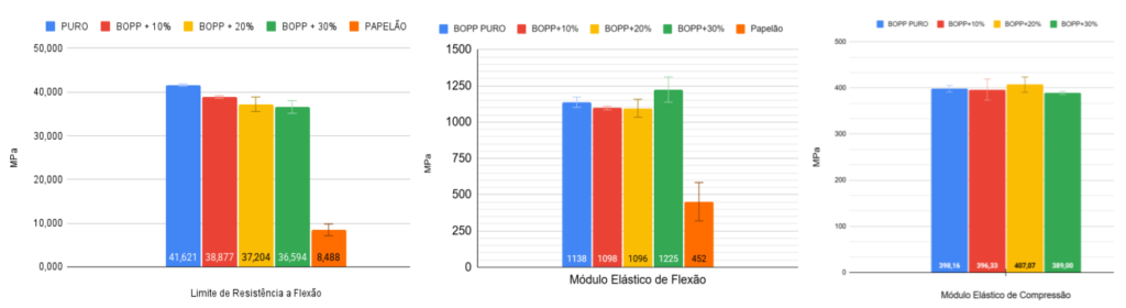 Após o ensaio de compressão, o módulo de resistência a compressão dos corpos de prova, apresentados na Figura 3c, foram avaliados conforme a norma de compressão para termoplásticos, e os resultados mostraram pouca variação entre si, independentemente da quantidade de aparas gráficas adicionadas ao material. A principal hipótese para explicar esse resultado é a de que o reforço em questão não modifica a capacidade da matriz, o BOPP reciclado, de absorver energia e se deformar sob forças de compressão.