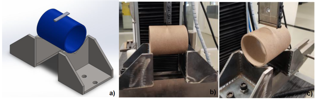 Essa análise permite a comparação direta do comportamento como tubete entre os materiais avaliados e o papelão comercial. Foi projetado um suporte para a realização de ensaios de flexão nos tubetes, adaptado da norma ISO 11093-6-2005, para flexão em tubos de papelão, como mostra a Figura 4a.