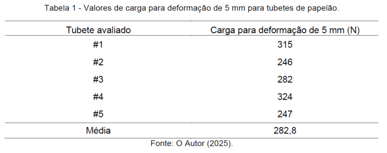Os valores obtidos para a deformação pré-determinada para 5 tubetes foram avaliados, e uma média da quantidade de carga necessária para a deformação desejada foi determinada. Os valores obtidos podem ser observados na Tabela 1: