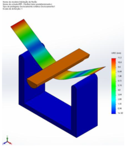 A seguir foram realizadas simulações de flexão em corpos de prova modelados a partir da norma para flexão em polímeros previamente utilizada, de forma a permitir a correção do módulo elástico do material compósito.