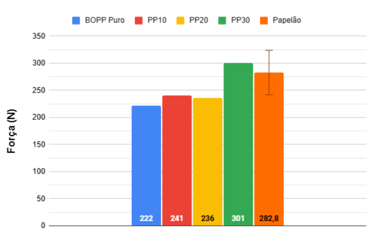 Sendo assim, é possível concluir que o material polimérico possui características mecânicas comparáveis às do papelão de uso comercial de forma geral, mas com uma notável diferença na resistência à força aplicada com o aumento da quantidade de reforço utilizada. Embora todas as blendas de BOPP reciclado com aparas gráficas demonstrarem boas propriedades, os tubetes utilizados na indústria flexográfica requerem um alto nível de resistência a deformação, visto que o encaixe no eixo do maquinário de impressão é essencial. Dessa forma, a blenda composta de 70% de BOPP reciclado e 30% de aparas gráficas (em massa) se destaca como compósito para substituição do papelão como matéria prima para rolos de bobinas gráficas para filmes flexográficos, visto que foi o único que suportou mais carga que o papelão, representando ser mais difícil sobre deformação.